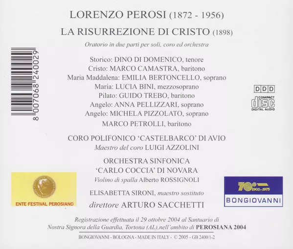 | Wykonawca | Arturo Sacchetti | Lorenzo Perosi | Orchestra Sinfonica Carlo Coccia | Coro Polifonico Castelbarco of Avio |