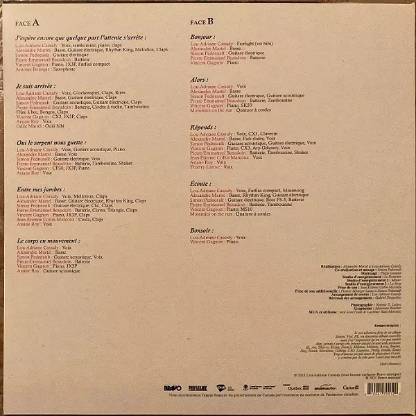 Bass, Electric Guitar, Drum Machine [Rhythm King], Melodica, Handclaps Alexandre Martel | Drums Pierre-Emmanuel Beaudoin | Electric Guitar Simon Pedneault | Lyrics By Alexandre Martel, Lou-Adriane Cassidy | Music By Lou-Adriane Cassidy | Piano, Synth [JX3P], Organ [Farfisa Compact] Vincent Gagnon | Saxophone Antoine Bourque | Vocals, Tambourine, Piano, Handclaps Lou-Adriane Cassidy