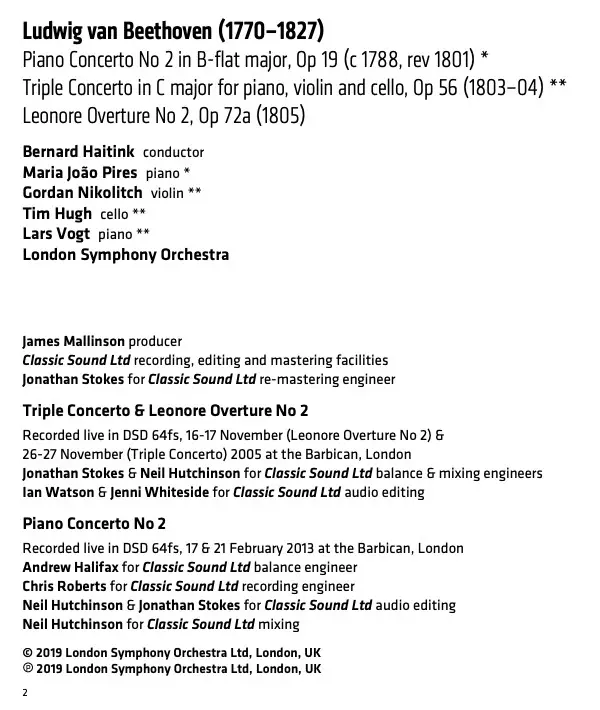 Wykonawca | The London Symphony Orchestra | Ludwig van Beethoven | Bernard Haitink | Maria-João Pires | Lars Vogt | Gordan Nikolitch | Tim Hugh |