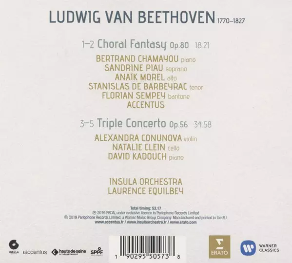 Wykonawca | Ludwig van Beethoven | Bertrand Chamayou | Stanislas de Barbeyrac | Laurence Equilbey | Insula Orchestra | David Kadouch | Natalie Clein | Sandrine Piau | Florian Sempey | Alexandra Conunova | Chœur De Chambre Accentus | Anaïk Morel |