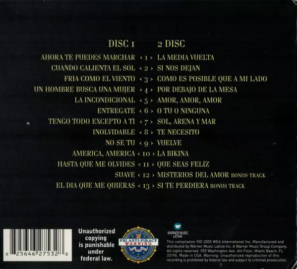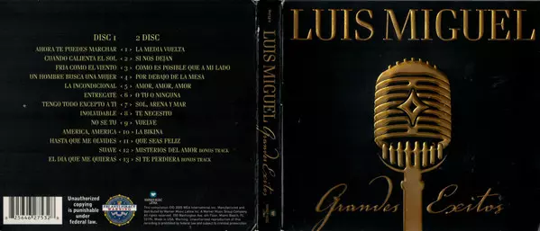 Luis Miguel: Grandes Exitos Wersja na 2CD w standardowe wydanie. Ta konkretna edycja została wydana w USA w wydawnictwie Warner Music Latina dnia 22. listopada 2005. Album sięga do gatunku Pop, Muzyka latynoska, Ballada, Mariachi, Europop i Bolero.