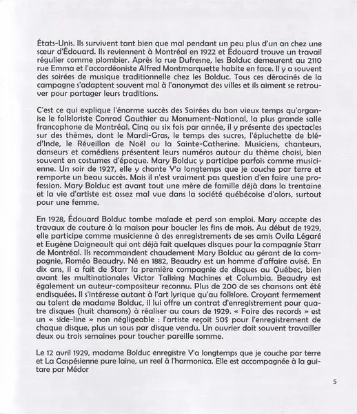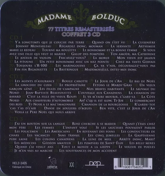 Madame Bolduc: L'anthologie Wersja na 3CD/Zestaw pudełkowy w standardowe wydanie. Ta konkretna edycja została wydana w Kanada w wydawnictwie Disques Helena dnia 6. listopada 2007. Album sięga do gatunku Pop, Folk, World, & Country, Folk i Chanson.