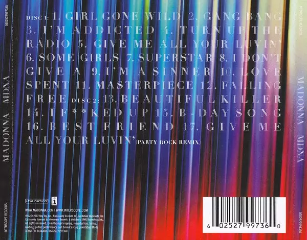 Madonna: MDNA DLX Wersja na 2CD w deluxe wydanie. Ta konkretna edycja została wydana w Europa w wydawnictwie Interscope Records we współpracy z Live Nation dnia 26. marca 2012.