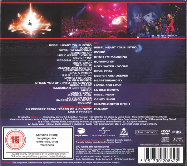 Madonna: Rebel Heart Tour Wersja na CD/DVD w standardowe wydanie. Ta konkretna edycja została wydana w Europa w wydawnictwie Eagle Vision we współpracy z Universal Music Group, Maverick i Live Nation dnia 15. września 2017.