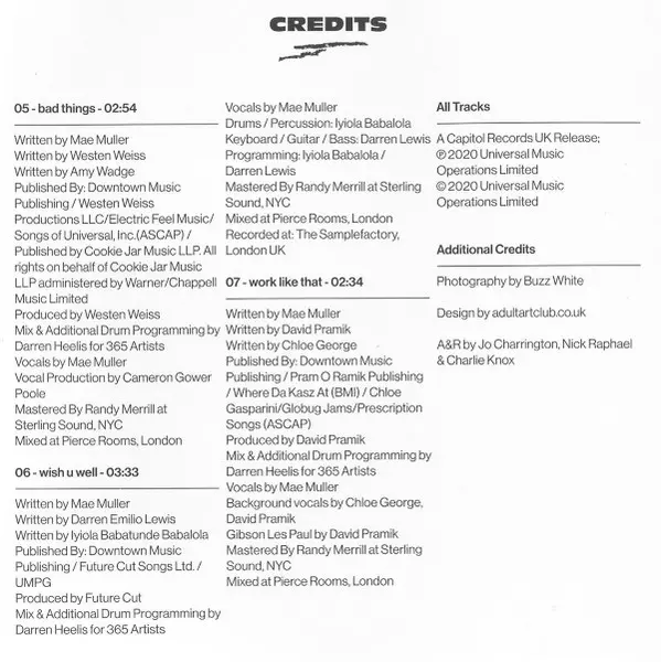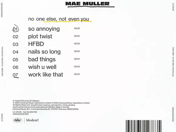 Mae Muller: No One Else, Not Even You Wersja na CD w standardowe wydanie. Ta konkretna edycja została wydana w WIELKA BRYTANIA w wydawnictwie Capitol Records UK we współpracy z Modest! dnia 27. listopada 2020. Album można sklasyfikować jako gatunek Pop.