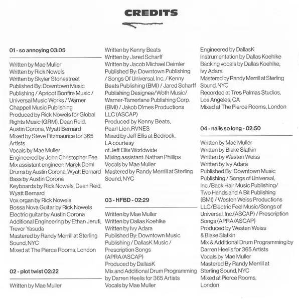 Mastered By Randy Merrill | Mixed By [Assistant] Nathan Phillips (11) | Producer Kenny Beats, Pearl Lion, Rvnes | Written-By Jacob Michael Deimler, Jared Scharff, Kenny Beats
