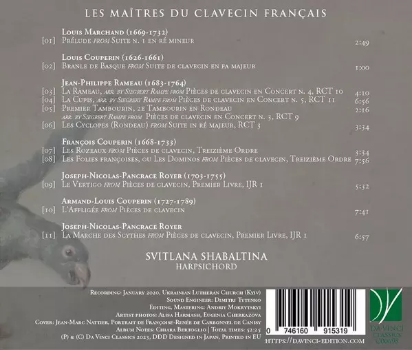 | Wykonawca | Jean-Philippe Rameau | François Couperin | Louis Couperin | Joseph Nicolas Pancrace Royer | Armand-Louis Couperin | Louis Marchand | Svitlana Shabaltina |