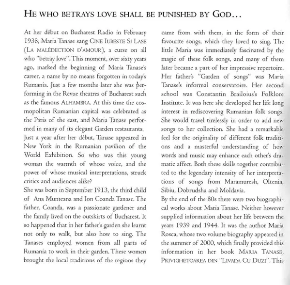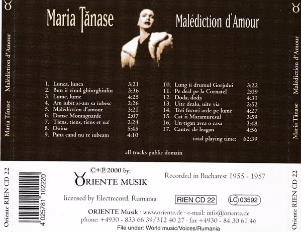 Maria Tănase: Malédiction D'Amour Wersja na CD w standardowe wydanie. Ta konkretna edycja została wydana w Niemcy w wydawnictwie Oriente Musik dnia 25. stycznia 2001. Album sięga do gatunku Muzyka klasyczna, Folk, World, & Country, Ballada, Folk i Chanson.
