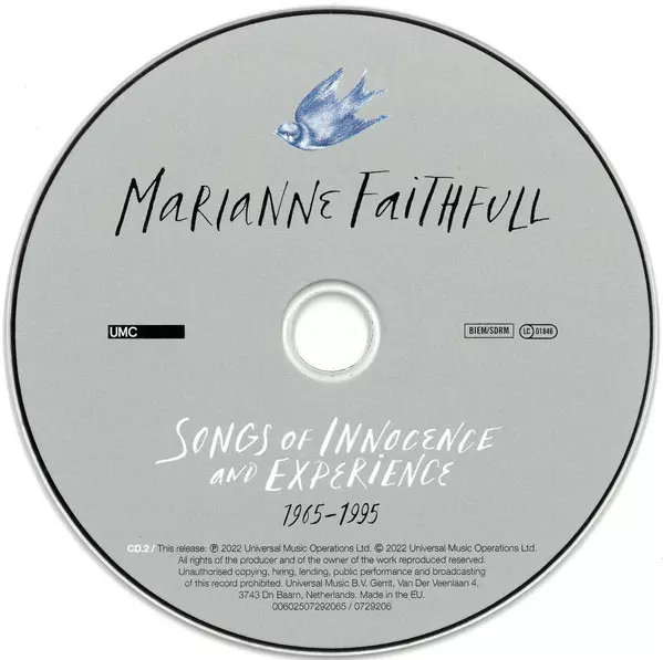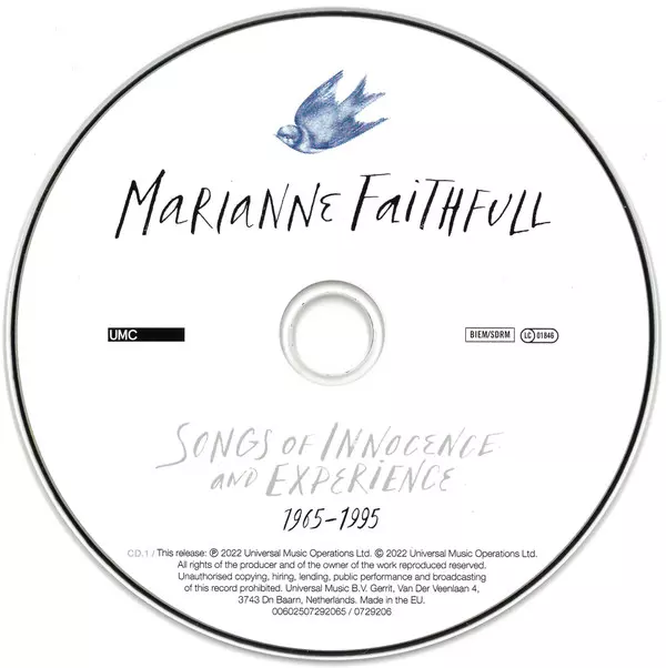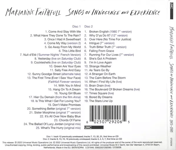 Marianne Faithfull: Songs Of Innocence And Experience (1965-1995) Wersja na 2CD w zremasterowane wydanie. Ta konkretna edycja została wydana w Europa w wydawnictwie UMC dnia 21. października 2022. Album sięga do gatunku Rock, Pop, Folk, World, & Country, Muzyka elektroniczna, Blues, Alternative rock, Pop Rock, Folk, Art Rock, Synth-Pop, Blues-Rock i Classic Rock.