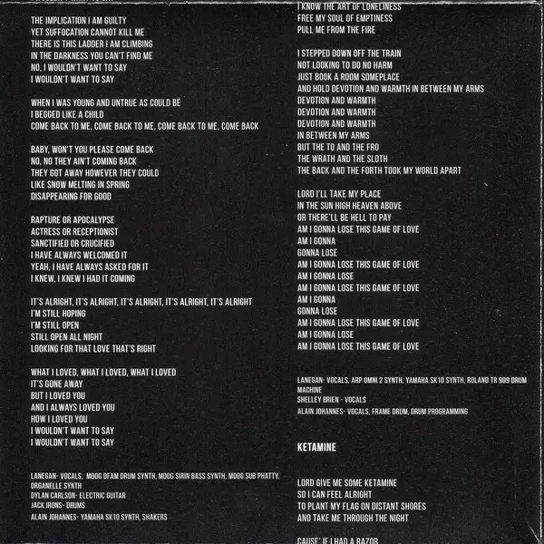 Bass Jack Bates | Piano, Electric Piano [Wurlitzer Electric Piano] Ed Harcourt | Vocals Wes Eisold | Vocals, Synth [Rolland Juno Synth], Drum Machine [909 Drum Machine] Mark Lanegan