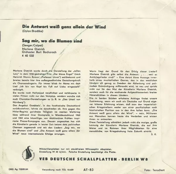 | Tytuł | Die Antwort Weiß Ganz Allein Der Wind / Sag Mir, Wo Die Blumen Sind |