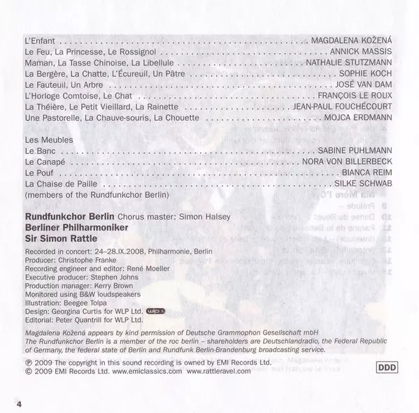 | Wykonawca | Berliner Philharmoniker | Sir Simon Rattle | Maurice Ravel | Magdalena Kožená | José van Dam | Sophie Koch | Nathalie Stutzmann | Mojca Erdmann | Jean-Paul Fouchécourt | Annick Massis | François Le Roux |