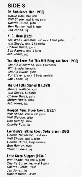 Jug Jab Jones | Violin Milton Robie | Vocals, Guitar Charlie Burse | Vocals, Kazoo Ben Ramey | Vocals, Lead Guitar Will Shade