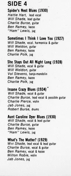 Drums, Washboard Robert Burse | Guitar, Harmonica Will Shade | Mandolin Charlie Burse | Piano Jab Jones