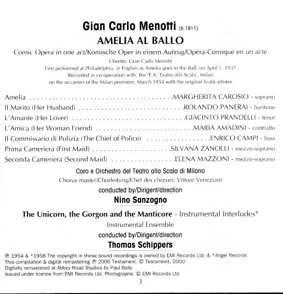 | Wykonawca | Gian Carlo Menotti | Nino Sanzogno | Thomas Schippers |