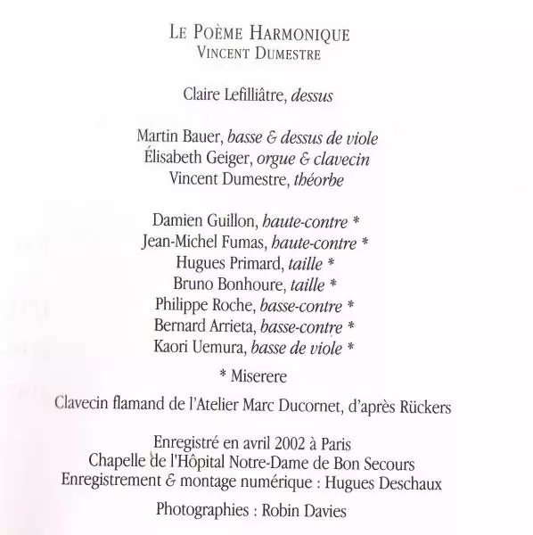 | Wykonawca | Michel Richard Delalande | Vincent Dumestre | Le Poème Harmonique | Claire Lefilliâtre |