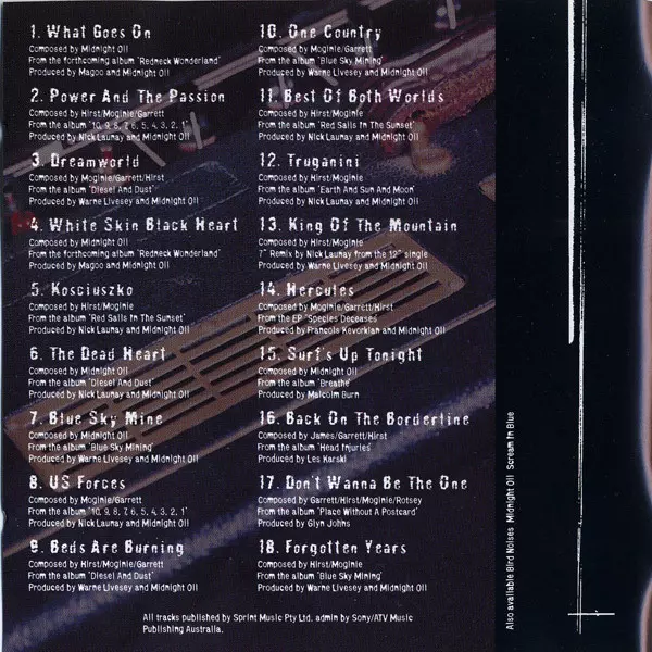 Nie robiąc wielkiego zamieszania z okazji swojej 20. rocznicy, Midnight Oil wyprodukował swoją pierwszą płytę "Best Of" po łącznie 12 longplayach i 2 EP-kach. Wydana w 1997 roku, ta wypełniona po brzegi kolekcja hitów najbardziej znanych australijskich eko-rockowców zawiera "Beds Are Burning", "Blue Sky Mine", "Power & The Passion" - w sumie 17 ...
