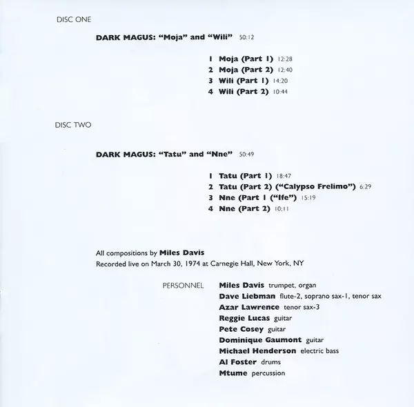 The double album Dark Magus was recorded on March 30, 1974 at New York's Carnegie Hall. Miles Davis' band at the time consisted of bassist Michael Henderson, drummer Al Foster, percussionist James Mtume, saxophonist Dave Liebman and guitarists Pete Cosey and Reggie Lucas. Dark Magus was produced by Teo Macero and features four two-part recording...
