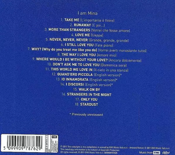 Mina: I Am Wersja na CD w zremasterowane wydanie. Ta konkretna edycja została wydana w Włochy w wydawnictwie Capitol Music we współpracy z EMI dnia 14. marca 2011. Album sięga do gatunku Pop, Wokal, Szlagiery i Europop.