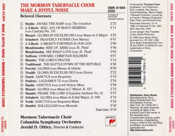Mormon Tabernacle Choir: Make A Joyful Noise (Beloved Choruses) Wersja na CD w standardowe wydanie. Ta konkretna edycja została wydana w USA w wydawnictwie Sony Classical dnia 5. grudnia 1995. Album sięga do gatunku Muzyka klasyczna i Choral.