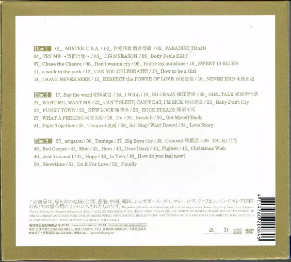 Namie Amuro: Finally Wersja na 3CD w standardowe wydanie. Ta konkretna edycja została wydana w Azja Południowo-Wschodnia w wydawnictwie Avex Taiwan we współpracy z Dimension Point dnia 29. grudnia 2017. Album sięga do gatunku Pop, Muzyka elektroniczna, Hip Hop, Ballada, Dance-pop, Electro House, J-pop, Eurobeat i Hip-House.