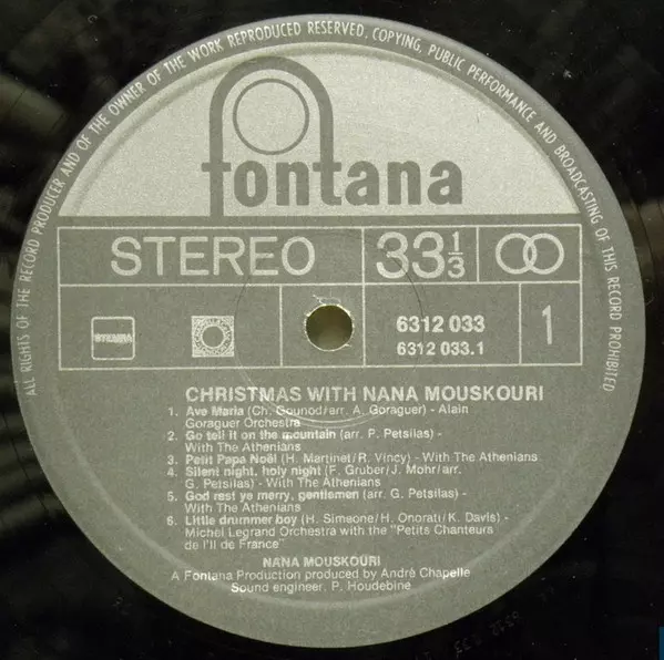 | B1 | Nana Mouskouri, Christian Chevallier Et Son Orchestre: Deck The Halls With Boughs Of Holly | ||