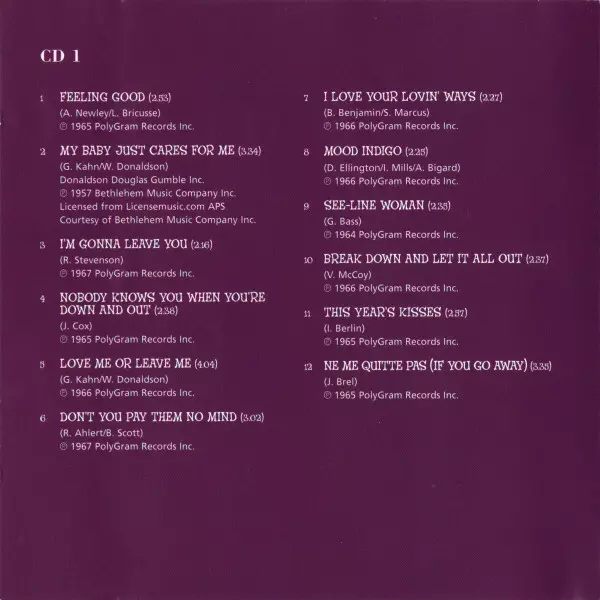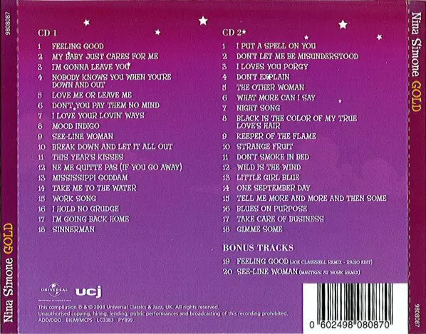 Nina Simone: Gold Wersja na 2CD w standardowe wydanie. Ta konkretna edycja została wydana w WIELKA BRYTANIA w wydawnictwie Universal Classics & Jazz we współpracy z UCJ dnia 15. lipca 2003. Album sięga do gatunku Rock, Pop, Jazz, Funk / Soul, Wokal i Soul.