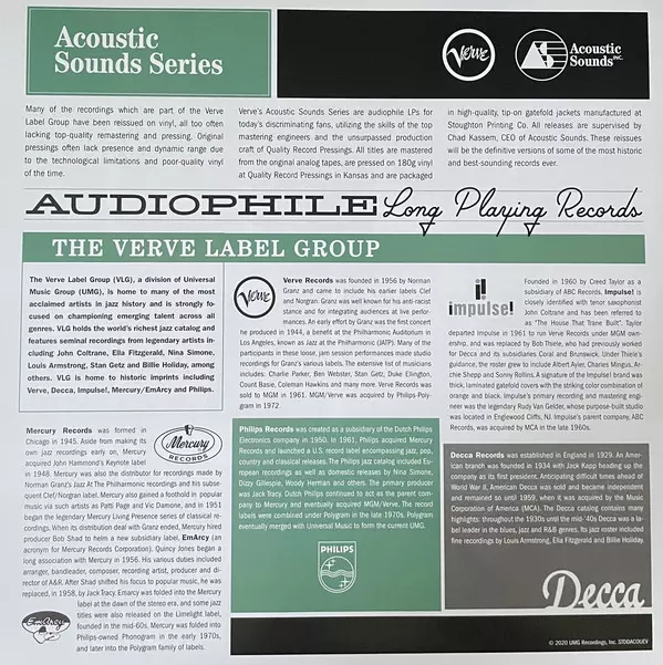In their quest for the definitive audiophile versions of some of the most historic and finest jazz recordings ever made, Verve Label Group and Universal Music Enterprises are harnessing the skills of top mastering engineers and the unrivalled production expertise of Quality Record Pressings for a new audiophile series of Acoustic Sounds vinyl re...