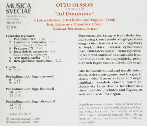 | Tytuł | Ad Dominum (6 Latinska Hymner, 3 Preludier Och Fugor, Credo) |