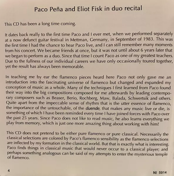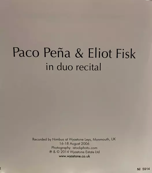 Paco Peña & Eliot Fisk: In Duo Recital Wersja na CD w standardowe wydanie. Ta konkretna edycja została wydana w WIELKA BRYTANIA w wydawnictwie Nimbus Records dnia 27. sierpnia 2014. Album sięga do gatunku Muzyka klasyczna, Muzyka barokowa, Modernism i Romantyzm.