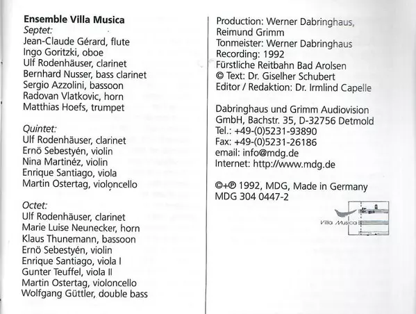 | Bassoon Klaus Thunemann | Cello Martin Ostertag | Clarinet Ulf Rodenhäuser | Double Bass Wolfgang Güttler | Horn Marie Luise Neunecker | Viola [II] Gunter Teuffel | Viola [I] Enrique Santiago | Violin Ernö Sebestyen | ||