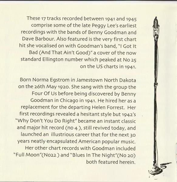 Peggy Lee była amerykańską piosenkarką jazzową i muzyki popularnej, autorką tekstów, kompozytorką i aktorką, której kariera trwała sześć dekad. Urodziła się jako Norma Deloris Egstrom 26 maja 1920 roku w Jamestown w Północnej Dakocie i stała się jedną z najbardziej wpływowych wokal...