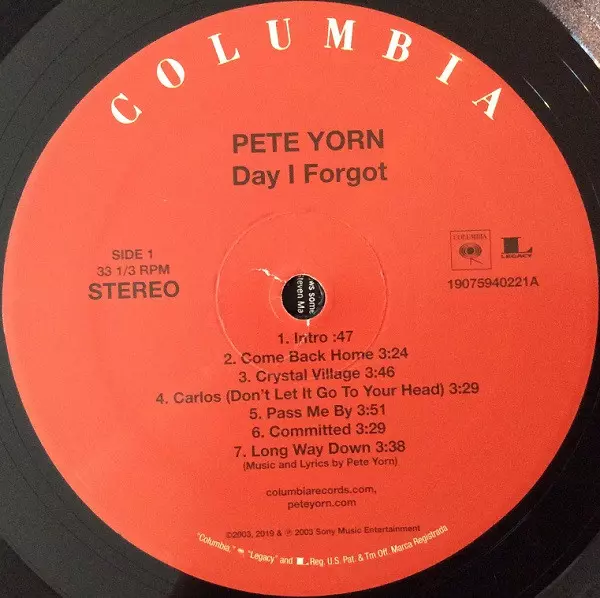 Pete Yorn: Day I Forgot Wersja na winylu LP w standardowe wydanie. Ta konkretna edycja została wydana w USA w wydawnictwie Columbia we współpracy z Legacy dnia 29. listopada 2019. Album sięga do gatunku Rock, Alternative rock i Pop Rock.