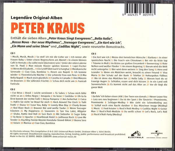 Peter Kraus: Big Box Wersja na 4CD w standardowe wydanie. Ta konkretna edycja została wydana w Niemcy w wydawnictwie Universal Music Group dnia 30. kwietnia 2021. Album sięga do gatunku Rock, Pop, Muzyka klasyczna, Szlagiery, Rock & Roll i Operetta.