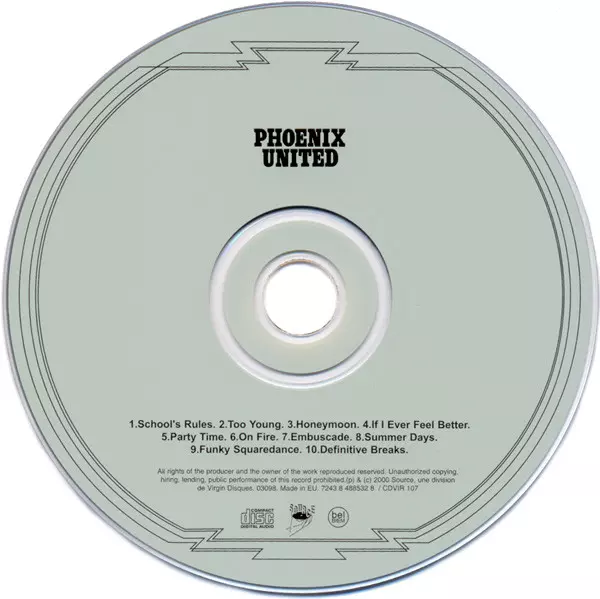 Phoenix: United Wersja na CD w standardowe wydanie. Ta konkretna edycja została wydana w Europa w wydawnictwie Source we współpracy z Virgin dnia 19. września 2000. Album sięga do gatunku Rock, Muzyka elektroniczna, Pop Rock, Downtempo, House i Disco.