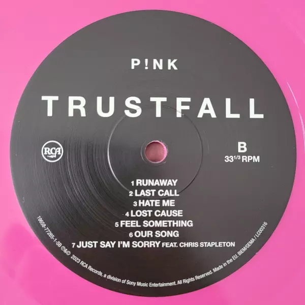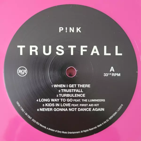 P!NK: Trustfall CLR | LTD Wersja na winylu LP w kolorowane ograniczone wydanie. Ta konkretna edycja została wydana w Europa, USA i Kanada w wydawnictwie RCA we współpracy z Sony Music dnia 17. lutego 2023.