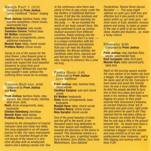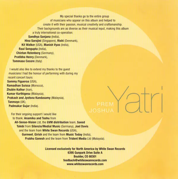 Prem Joshua: Yatri (Mystics Of Sound) Wersja na CD w standardowe wydanie. Ta konkretna edycja została wydana w USA w wydawnictwie White Swan Records dnia 1. maja 2006. Album sięga do gatunku Folk, World, & Country i Indian Classical.