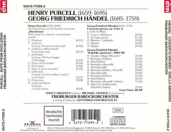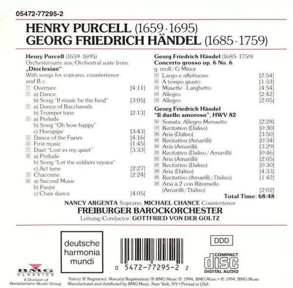 | Wykonawca | Georg Friedrich Händel | Henry Purcell | Freiburger Barockorchester | Michael Chance | Nancy Argenta | Gottfried Von Der Goltz |