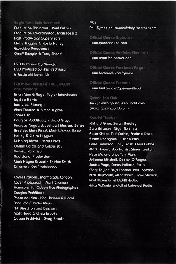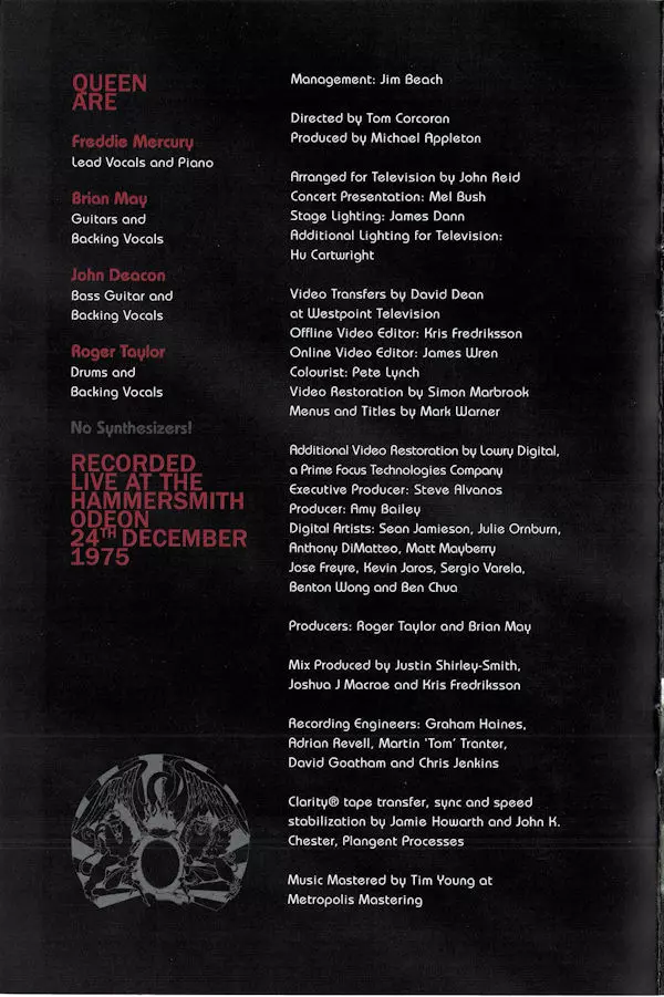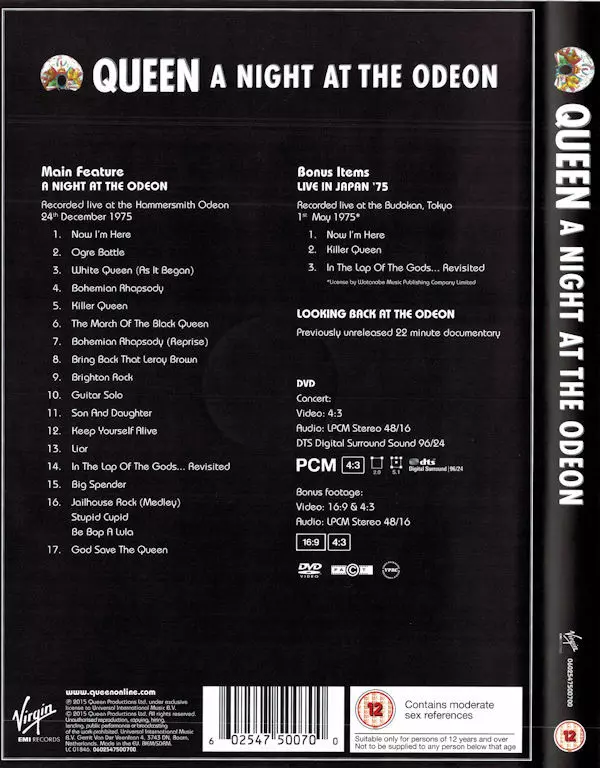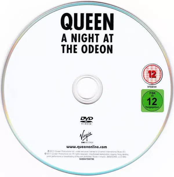 Queen: A Night At The Odeon Wersja na DVD w standardowe wydanie. Ta konkretna edycja została wydana w Europa w wydawnictwie Virgin EMI Records dnia 27. listopada 2015.