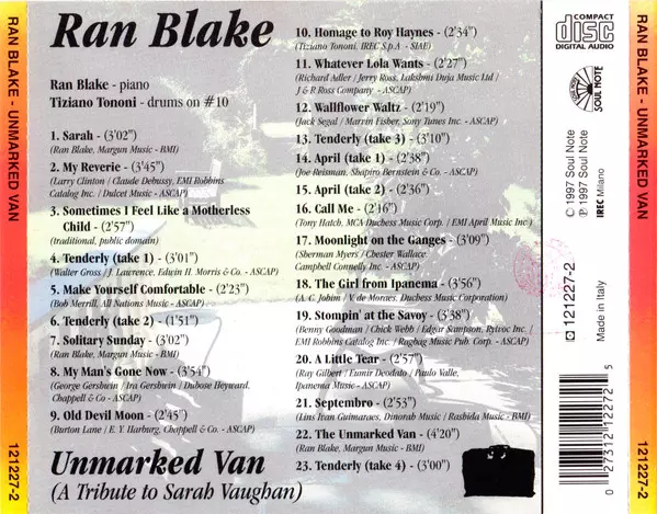 CD Ran Blake: Unmarked Van (A Tribute To Sarah Vaughan)