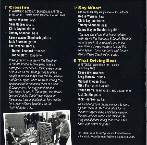 Drums Chris Layton | Guitar Jack Pearson | Guitar [Guitars] Kenny Wayne Shepherd | Horns The Texacali Horns | Keyboards [Keys] Reese Wynans | Performer [The Texacali Horns], Saxophone Joe Sublett | Performer [The Texacali Horns], Trumpet Darrell Leonard | Vocals Sam Moore | Written-By Bill Carter (2), Chris Layton, Reese Wynans, Ruth Ellen Ellsworth, Tommy Shannon