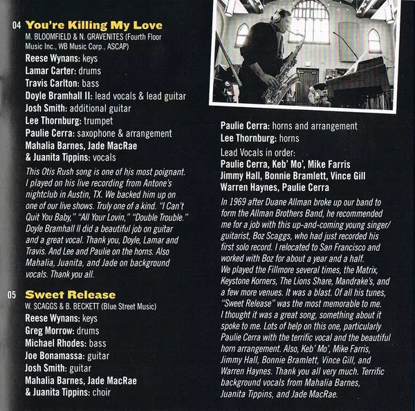 Bass Michael Rhodes | Choir Jade MacRae, Juanita Tippins, Mahalia Barnes | Drums Greg Morrow | Guitar Joe Bonamassa, Josh Smith (5) | Horns, Arranged By [Arrangements] Paulie Cerra | Keyboards [Keys] Reese Wynans | Lead Vocals [Lead Vocals In Order (1)] Paulie Cerra | Lead Vocals [Lead Vocals In Order (2)] Keb' Mo' | Lead Vocals [Lead Vocals In Order (3)] Mike Farris | Lead Vocals [Lead Vocals In Order (4)] Jimmy Hall | Lead Vocals [Lead Vocals In Order (5)] Bonnie Bramlett | Lead Vocals [Lead Vocals In Order (6)] Vince Gill | Lead Vocals [Lead Vocals In Order (7)] Warren Haynes | Lead Vocals [Lead Vocals In Order (8)] Paulie Cerra | Written-By Barry Beckett, Boz Scaggs