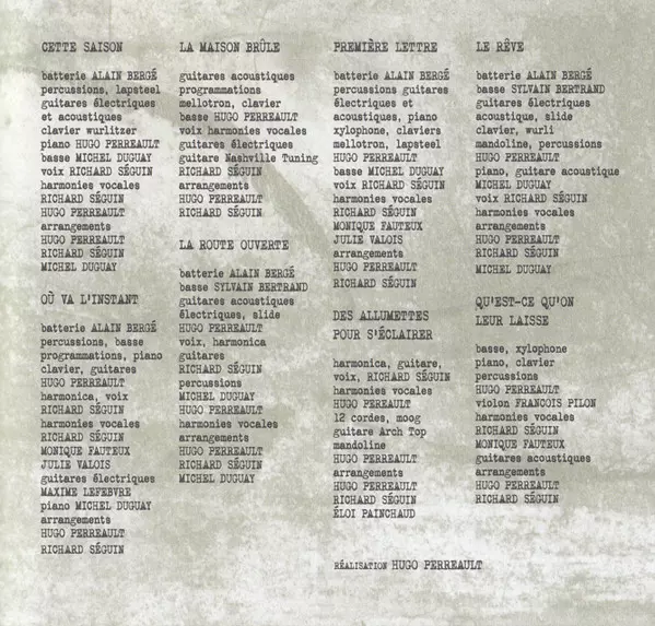 Arranged By Hugo Perreault, Michel Duguay, Richard Séguin | Bass Michel Duguay | Drums Alain Bergé (2) | Harmony Vocals Hugo Perreault, Richard Séguin | Lyrics By, Music By Richard Séguin | Percussion, Lap Steel Guitar, Electric Guitar, Acoustic Guitar, Keyboards, Electric Piano [Wurlitzer], Piano Hugo Perreault | Producer [Réalisation] Hugo Perreault | Vocals Richard Séguin