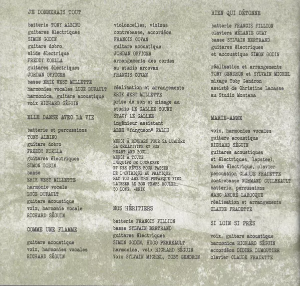 Acoustic Guitar, Electric Guitar, Lap Steel Guitar, Electric Bass, Keyboards, Percussion Claude Fradette | Contrabass Normand Guilbeault | Drums, Percussion Marc-André Larocque | Lyrics By, Music By Richard Séguin | Producer [Réalisation], Arranged By Claude Fradette | Vocals, Harmony Vocals, Acoustic Guitar Richard Séguin
