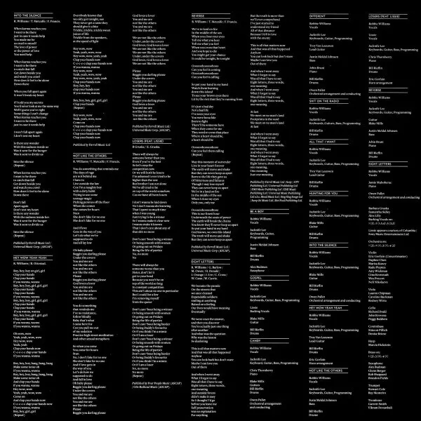 Arranged By [Orchestral], Conductor Owen Pallett | Drums William Rieflin | Guitar Blake Mills | Keyboards, Guitar, Bass, Programmed By Jacknife Lee | Piano Chris Thornberry | Vocals Robbie Williams | Written-By Gary Barlow, Robbie Williams, Terje Olsen