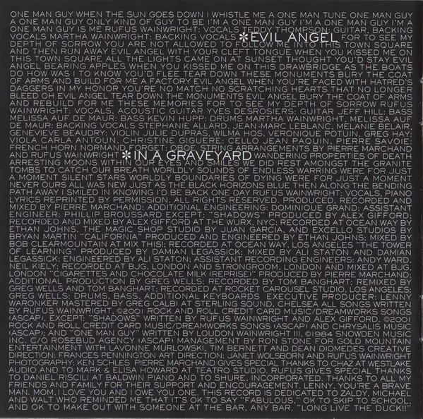 Bass Guitar Pete Wilson | Cello Laura Fairhurst | Drum Programming Steve Sidelnyk | Engineer Ali Staton | Guitar Ally McErlaine | Keyboards, Drum Programming, Guitar, Arranged By [String Arrangement] Damian LeGassick | Mixed By Ali Staton | Mixed By, Producer Damian LeGassick | Producer Damian LeGassick | Recorded By [Assistant Recording Engineers] Andy Ward (4), Neil Kiely | Strings Shakti Strings | Strings [Shakti Strings] Brigid Button, Sarah Button | Viola Hilary Skewes | Violin Becca Ware, Ian Rathbone | Vocals, Piano Rufus Wainwright
