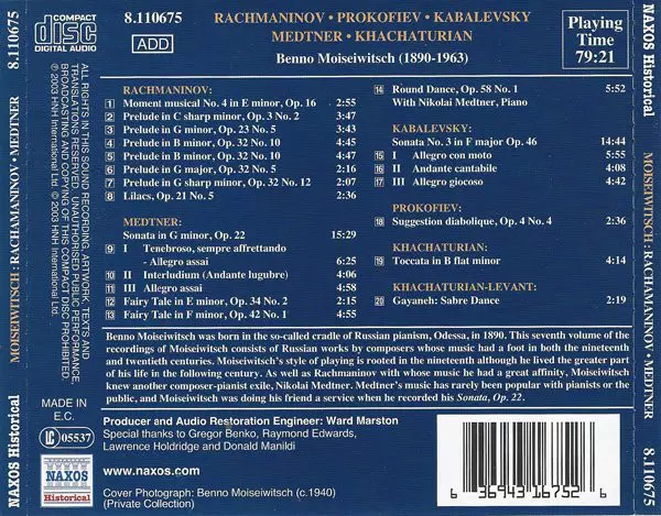 | Wykonawca | Sergei Vasilyevich Rachmaninoff | Aram Khatchaturian | Dmitry Kabalevsky | Nikolai Medtner | Benno Moiseiwitsch |