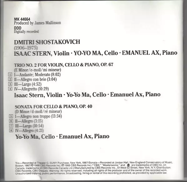 | Wykonawca | Dmitri Shostakovich | Yo-Yo Ma | Isaac Stern | Emanuel Ax |