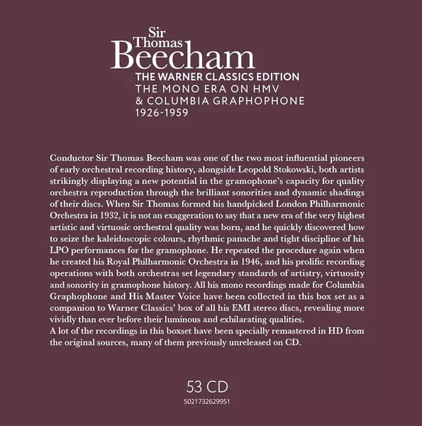 Sir Thomas Beecham: The Mono Era on HMV & Columbia Graphophone 1926-1959 Wersja na 53CD/Zestaw pudełkowy w standardowe wydanie. Ta konkretna edycja została wydana w Europa, Wielka Brytania i USA w wydawnictwie Warner dnia 16. stycznia 2026. Album sięga do gatunku Muzyka klasyczna, Orchestral, Romanticism i Concerto.