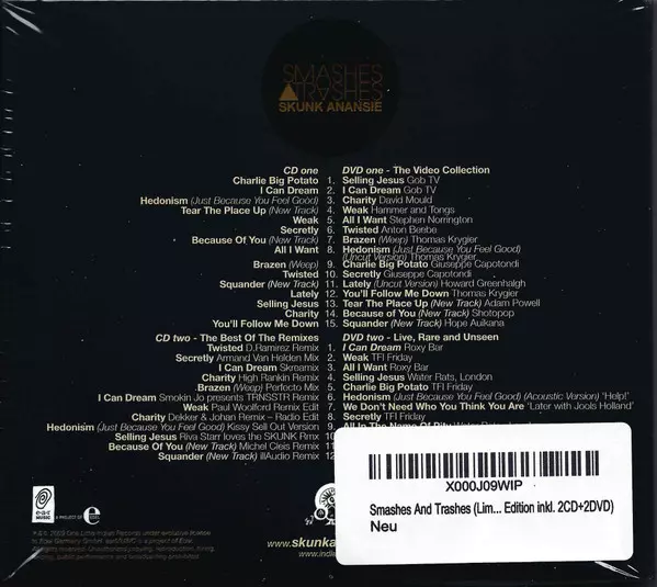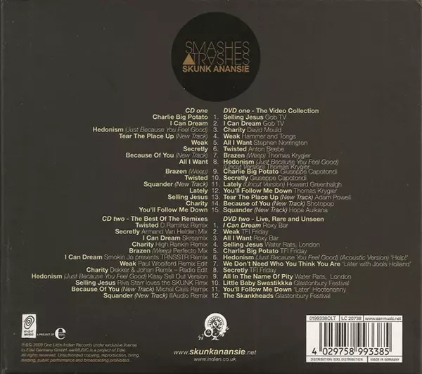 Skunk Anansie: Smashes & Trashes Wersja na 2CD/2DVD w standardowe wydanie. Ta konkretna edycja została wydana w Europa w wydawnictwie Ear Music dnia 3. listopada 2009. Album sięga do gatunku Alternative rock, Hard Rock, Funk Metal i Alternative Metal. CD + 2 DVD.